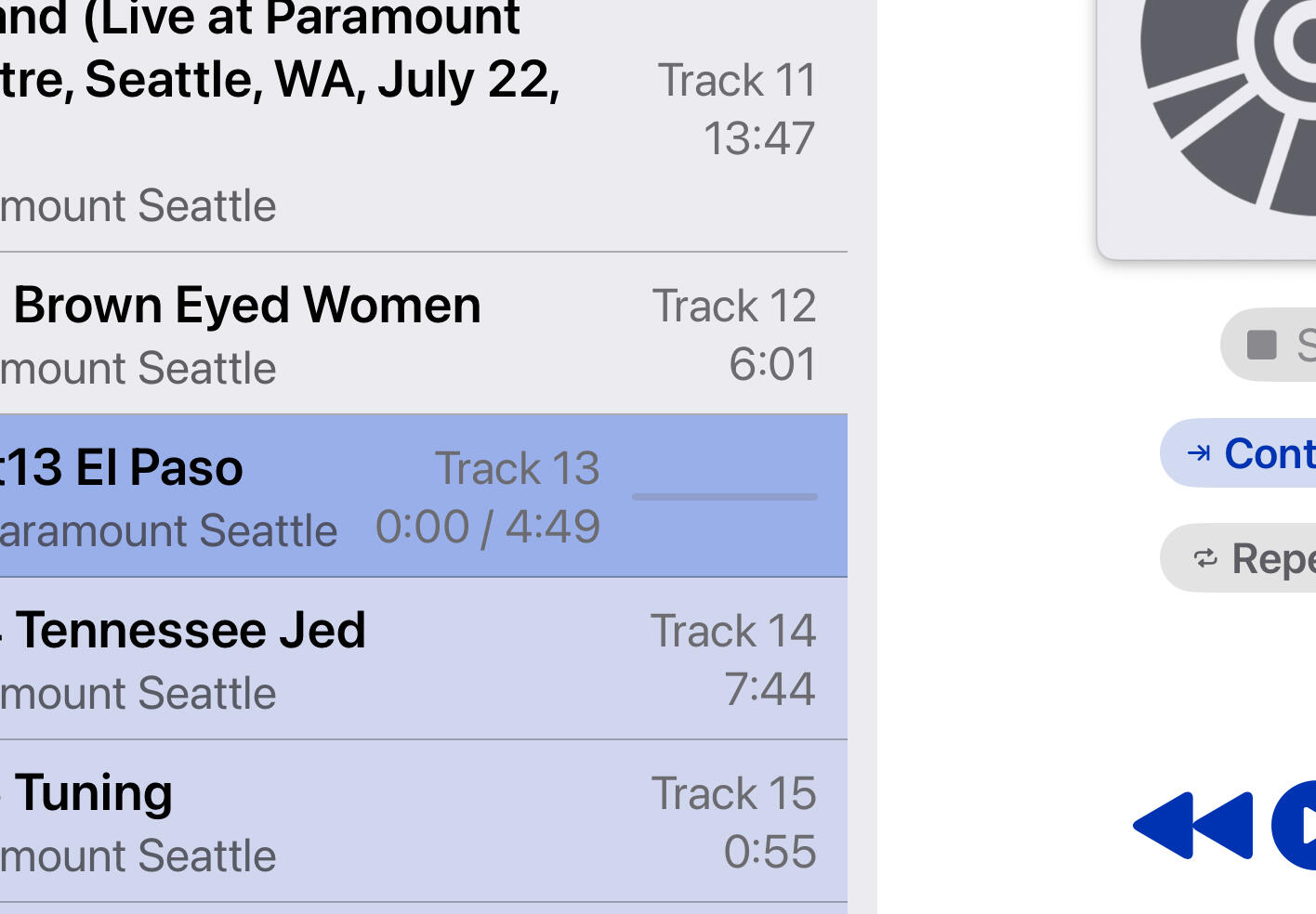Select the play mode: Single plays only the selected song, Continuous plays from selected song to end of list.
